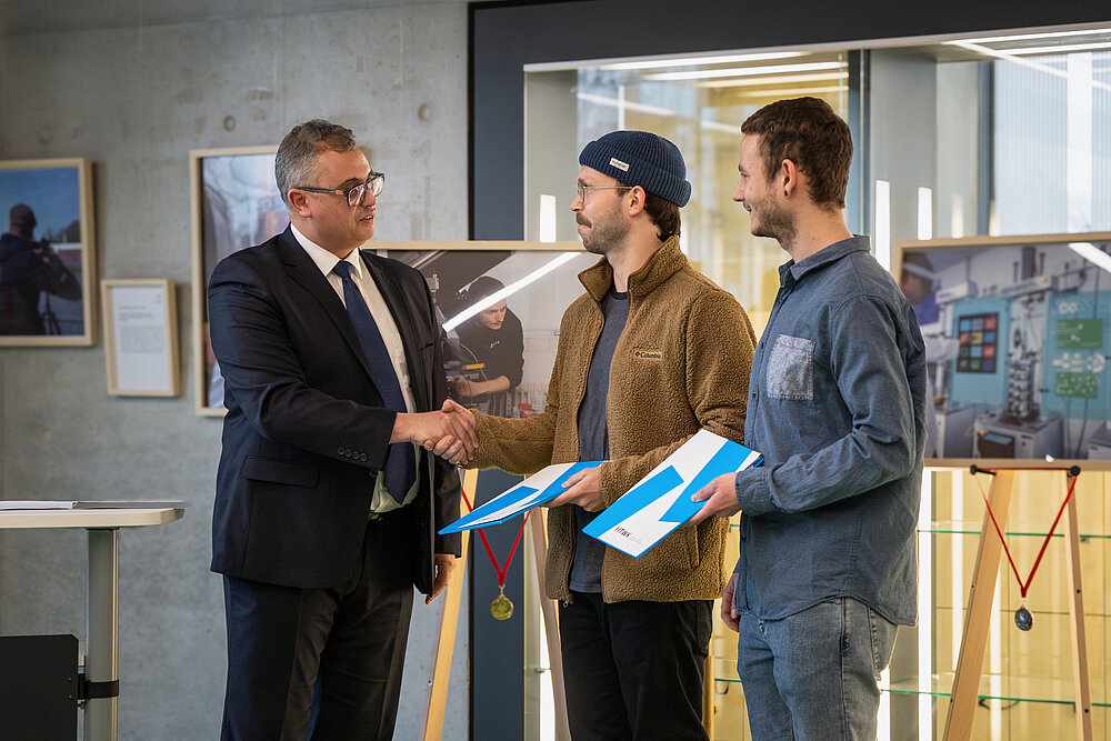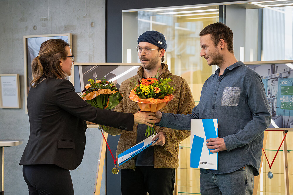 Der erste Platz des Fotowettbewerbs geht an Florian Muschka (links), Anika Mühl (rechts) und Sammy Schließer (Fotograf). Das Foto zeigt die Masterstudentin der Druck- und Verpackungstechnik und den wissenschaftlichen Mitarbeiter von Prof. Dr. Ingo Reinhold bei der Charakterisierung von gedruckten organisch elektrochemischen Transistoren (OECTs). Die hohe Empfindlichkeit und die Kompatibilität mit wässrigen Umgebungen machen OECTs ideal für Sensoranwendungen, beispielsweise in der Medizintechnik zur Glukosemessung. Die Transistoren stellten die Forschenden mittels Tampondruck her, einem Tiefdruckverfahren aus der grafischen Industrie, das sich besonders für gewölbte und unebene Oberflächen eignet. Mühl untersucht in ihrer Masterarbeit den Einfluss von Prozessparametern die Druckqualität und Leitfähigkeit von Silberstrukturen im Tampondruck. Muschka erforscht das Druckverfahren für dichtungsintegrierte Sensorik im Projekt „IntelliSeal“ am Forschungs- und Transferzentrum Leipzig der HTWK Leipzig.